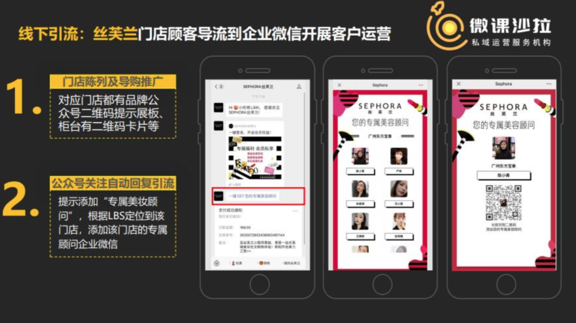 丝芙兰很早之前就布局了企业微信的私域玩法,门店里面会有品牌的公众号二维码,扫描二维码会提示添加专属美妆顾问企业微信个人号,会根据客户定位匹配门店的专属顾问,添加完毕之后会发消息提示注册丝芙兰小程序商城,注册完发送新用户的优惠券,如果没有使用券,后面的消息模板也会一直提示客户去使用。当七夕节、教师节等节日即将到来的时候,会通过企业微信去提醒顾客可以得到什么优惠,做到一对一沟通。