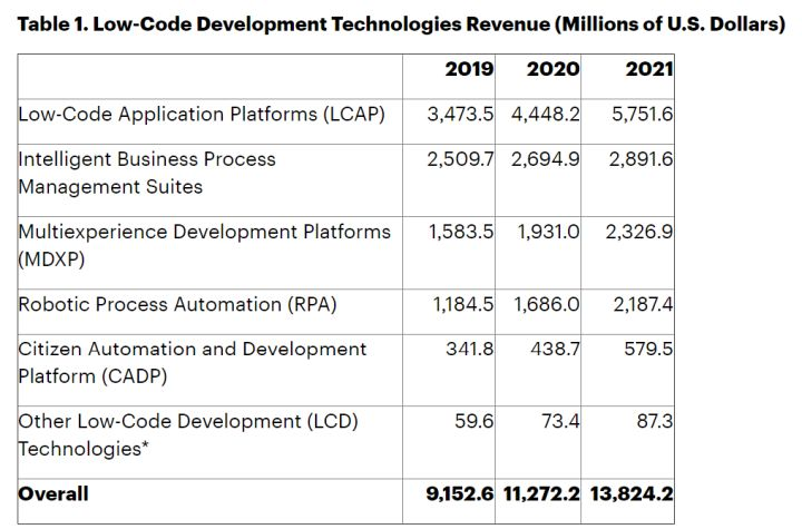 图为低代码开发技术收入(单位:百万美元)